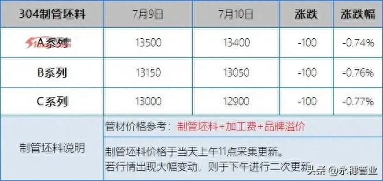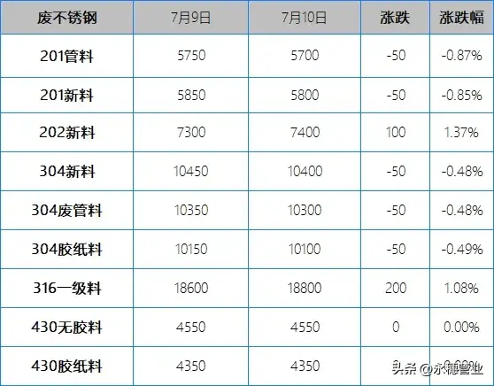 较昨日早间,今日早间市场201报价部分持平,部分下跌30-50元/吨;304报价部分持平,部分下跌50-100元/吨,目前主流报价区间:201新料5700-5800元/吨;304新料在10300-10400元/吨。